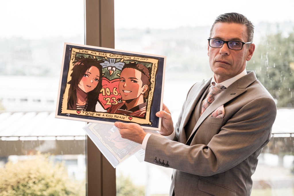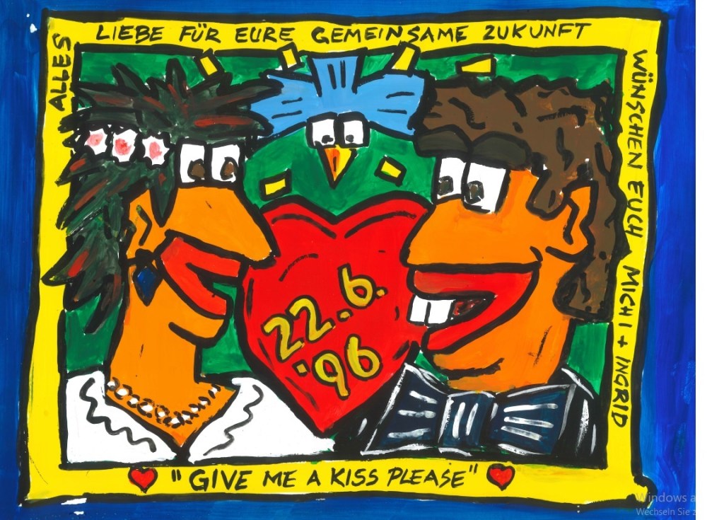 Ich, der Hasenpommel, musste natürlich auch meinen Senf zum Fest beitragen, und spendete einige Worte und den „Toast“ für das Brautpaar: „Alles Liebe für Eure gemeinsame Zukunft!“ Da verdrückte Ines kurz eine Träne der Erinnerung, das wollte ich nicht. Aber zuletzt überwog doch die Freude über das Überraschungsgeschenk, eine KI-unterstützte Persiflage eines Gemäldes, welches uns ein guter Freund, Michael Ratzenböck, bei meiner damaligen Hochzeit mit Pommeline vor rund 27 Jahren überreicht hatte. Danke an Mario, der dies ermöglicht hatte.