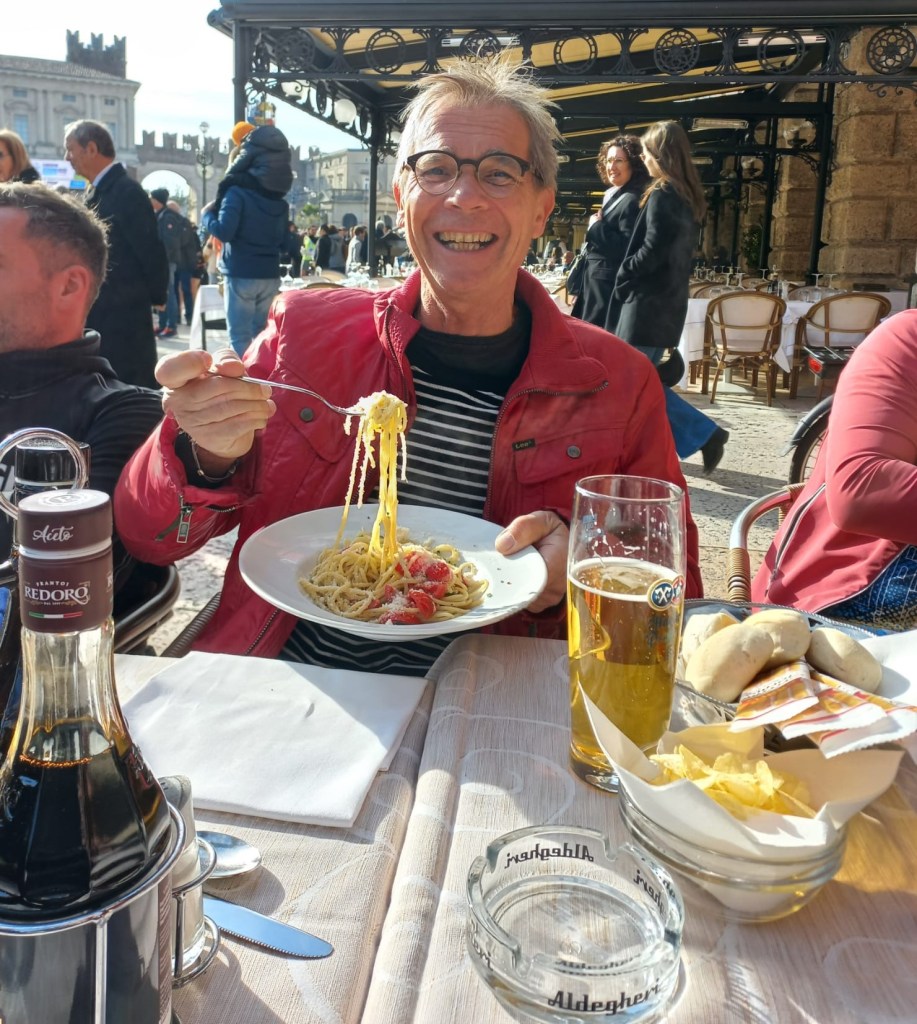 Startpackage abholen beim Hellas Stadion, strahlender Sonnenschein und frühlingshafte Temperaturen – ab in die Altstadt zur Arena Verona: Cappuccino, Prosecco, Papardelle, Spaghetti, Tagliatelle, Lugana, Bira grande …!