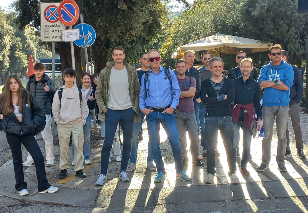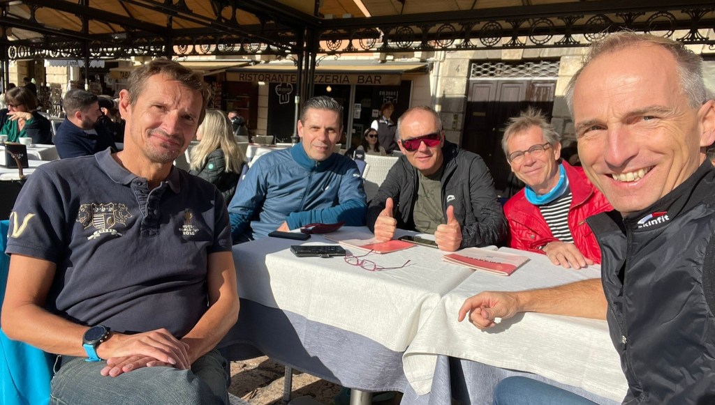 Los gings am 17. November 23 mit der ÖBB samt Schienenersatzverkehr zwischen Salzburg und Wörgl, Richtung Bella Italia mit einem Dutzend TriRunner on Board! Gut gelaunt, lässige Stimmung, der Schmäh lief – auf Kosten von Schwarz-Weiß: Blau Weiß hat kurz zuvor das Linzer Fußballstadtderby siegreich für sich entschieden – naja, sollen auch mal ihre Freude haben!