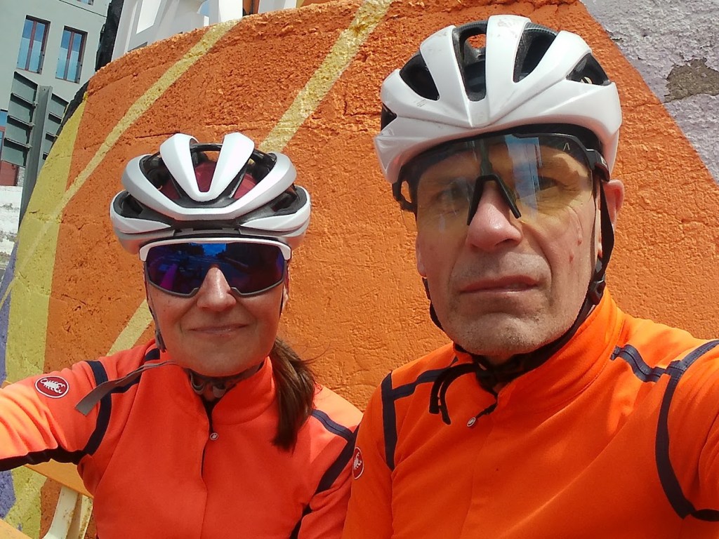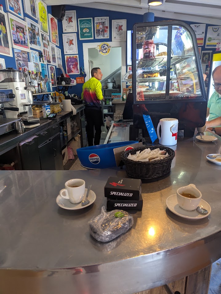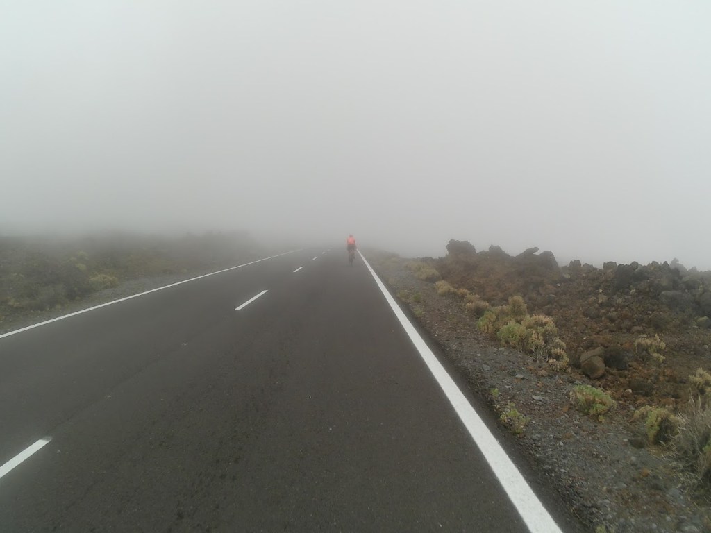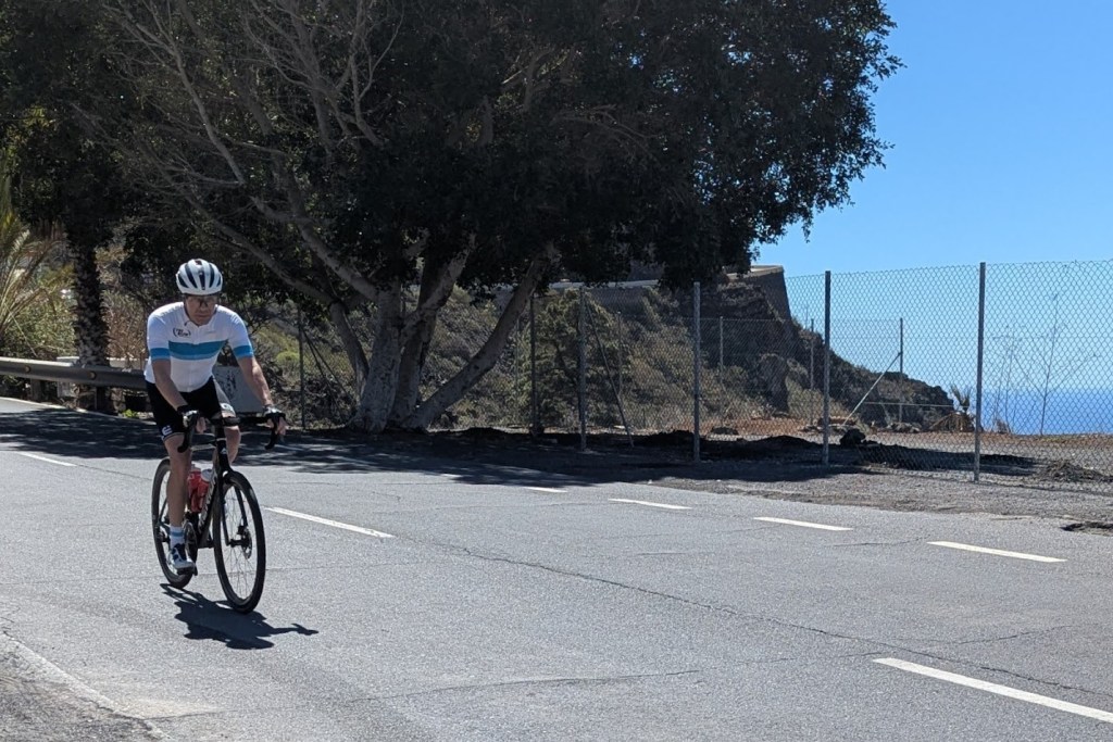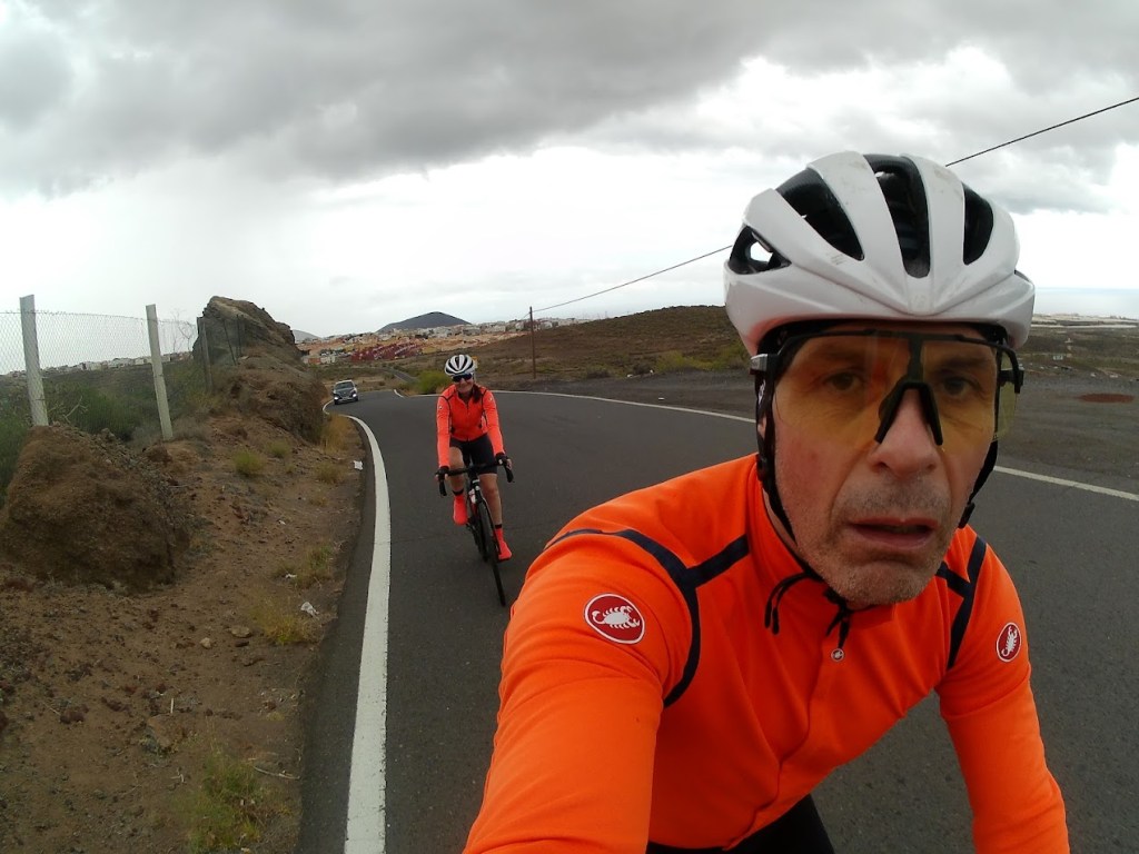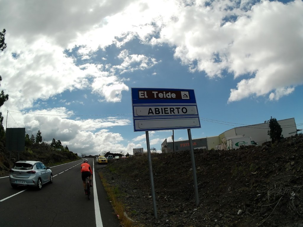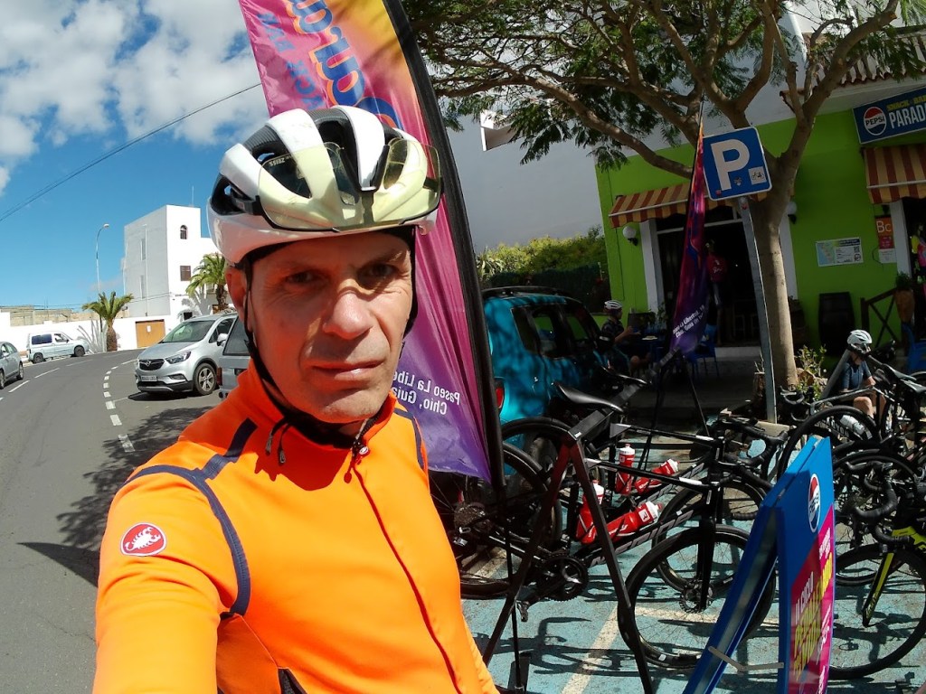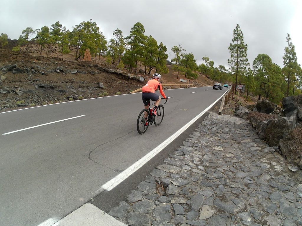 Und fast machte uns bei der Königsetappe auf den Teide das Wetter einen Strich durch die Rechnung. Schnee und Eis oben am Berg veranlassten die Kanarischen Behörden die Sperrung der Gebirgsstraße. Gott sei Dank besserten sich die Verhältnisse und wir konnten dann doch den ca. 55km langen Anstieg auf den Teide in Angriff nehmen. Nach 25 Kilometern dann der Patschen an Pommelines Hinterrad in der Ortschaft Chio. Glücklicherweise genau vor einem bekannten Radlertreff, da konnten wir einen Reifenheber ausleihen und bei einem Espresso den defekten Schlauch austauschen. Zwischenzeitig winkten einige vorbeibrausende Radprofis von den Teams „Red Bull Bora Hansgrohe“ und“VISMA Lease a Bike“ uns aufmunternd zu!