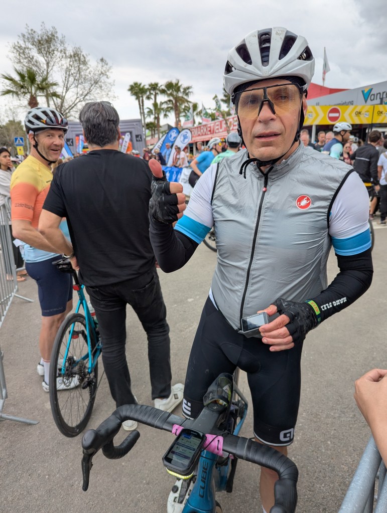 DAS RENNEN: Ein riesen Erlebnis mit 8500 Teilnehmern! Ich und Pommeline haben uns die mittlere Distanz gewählt: 227km und 3700 Höhenmeter im Tramontanagebirge. Das kleine Gewitter beim Start konnte uns nicht erschüttern – los gings und über 10 Stunden später war`s auch schon wieder vorbei -zufrieden rollte ich über die Ziellinie – ein herrliches Gefühl. Pommeline finishte die 167km – Distanz mit 2300 Höhenmetern in 7h20min bravourös – am Vortag lag sie noch mit einem bösen Magenvirus und Fieber im Bett, der Start war sehr unsicher. Daher Chapeau für diese Leistung – Gratulation!